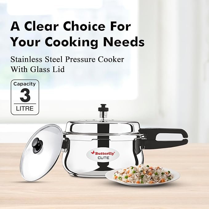Butterfly Cute SS Induction Compatible Outer Lid Stainless Steel Pressure Cooker With Glass Lid 3 liter, Silver
