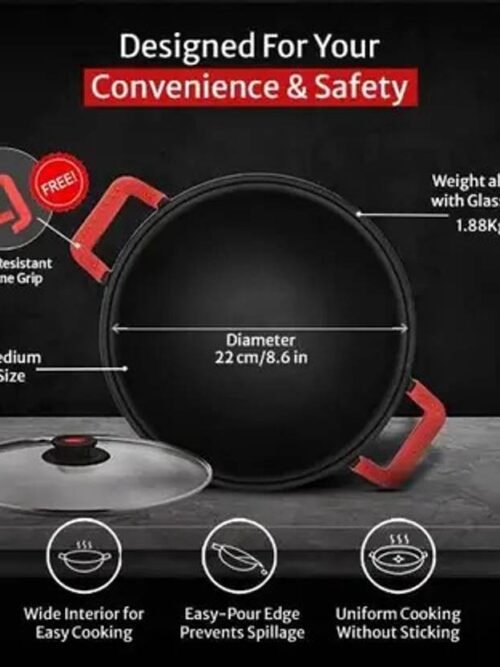 Pigeon Imperi Cast Iron 22cm Appachetty/Appam Pan, Free Glass Lid & Silicone Grips, Pre-seasoned,100% Toxin-Free, Naturally Nonstick Appachatti, Makes Food Tastier, Strong & Durable, Gas & Induction