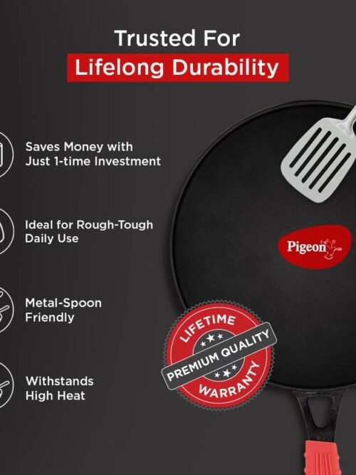 • 𝐍𝐀𝐓𝐔𝐑𝐀𝐋𝐋𝐘 𝐍𝐎𝐍-𝐒𝐓𝐈𝐂𝐊: Ready to use straight out of the box, Pigeon cast iron tawa comes pre-seasoned with natural vegetable oil. This seasoning creates a naturally non-stick surface that facilitates easy food release and effortless cleaning. The more you use the cast iron tawa, the better the seasoning becomes enhancing its non-stick properties. For best results, before the first use, a gentle wash and seasoning are recommended.