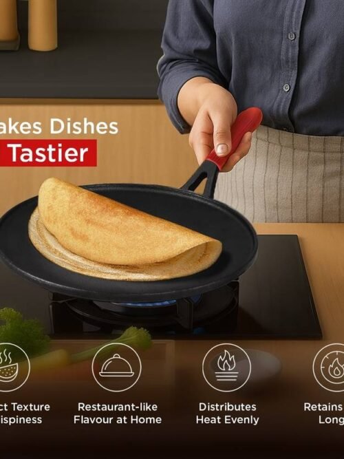 • 𝐇𝐄𝐀𝐋𝐓𝐇𝐘 𝐈𝐍𝐕𝐄𝐒𝐓𝐌𝐄𝐍𝐓 𝐅𝐎𝐑 𝐀 𝐋𝐈𝐅𝐄𝐓𝐈𝐌𝐄: Cast iron tawa lasts for generations thus saving you a lot of money in the long run. High-quality cast iron also heats quickly, evenly and retains heat longer. Thus saving you both gas and money, daily. TRUSTED FOR LIFELONG DURABILITY: Crafted with high quality cast iron, this heavy-duty cookware is designed for long-lasting use, offering reliable performance for decades. Built to last for generations, this cookware is designed to withstand high heat and is ideal for rough-tough daily use without any warping. Built to withstand the demands of everyday cooking, it is also scratch-resistant and metal spoon friendly.