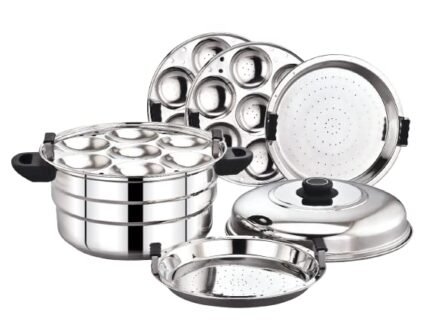 - Crafted with Atmost care for premium quality, this Idli maker is meticulously fashioned from durable stainless steel, boasting heavy-gauge construction. Its design assures not only longevity but also guarantees 100% food-grade safety, providing you with peace of mind.