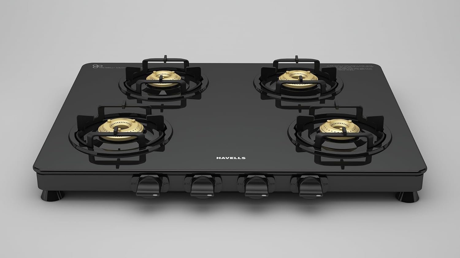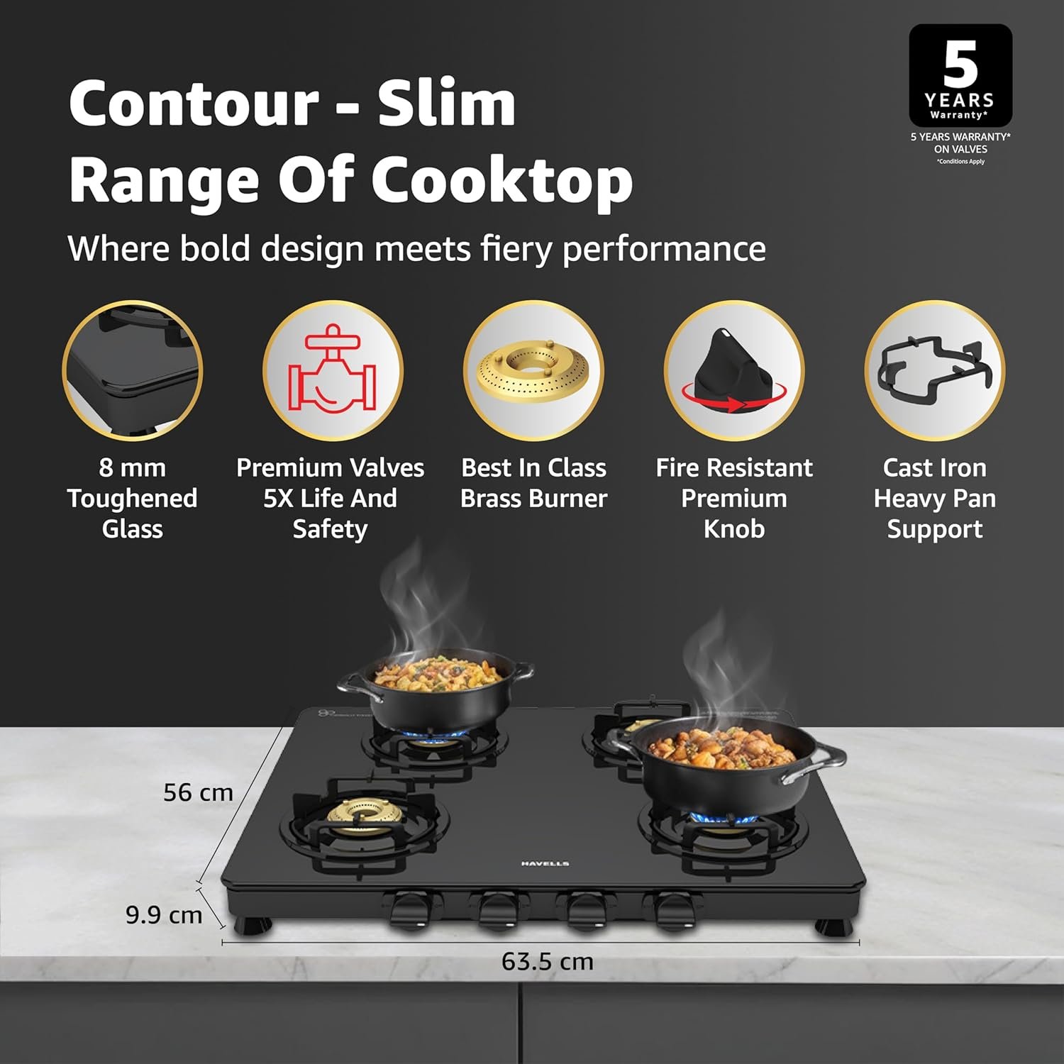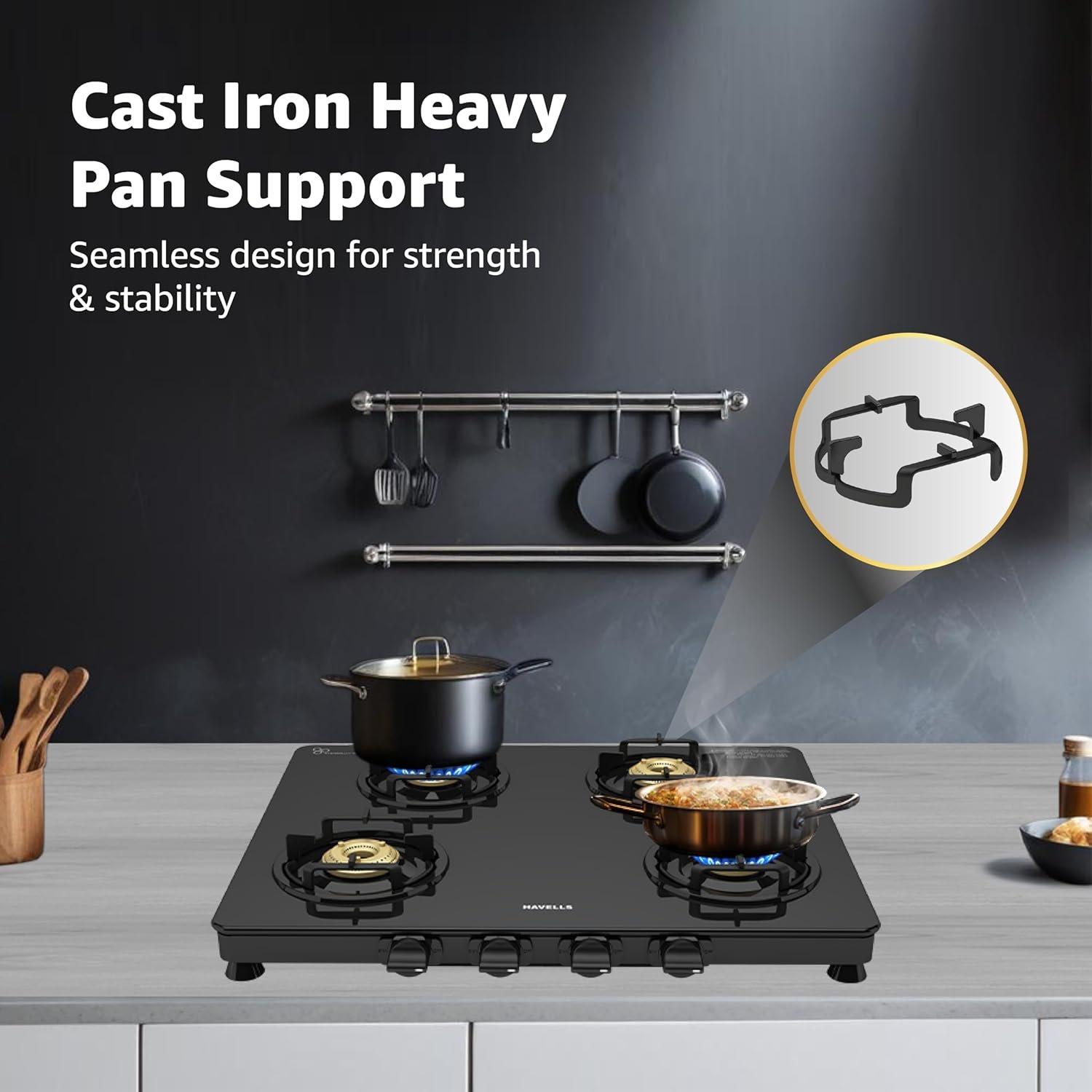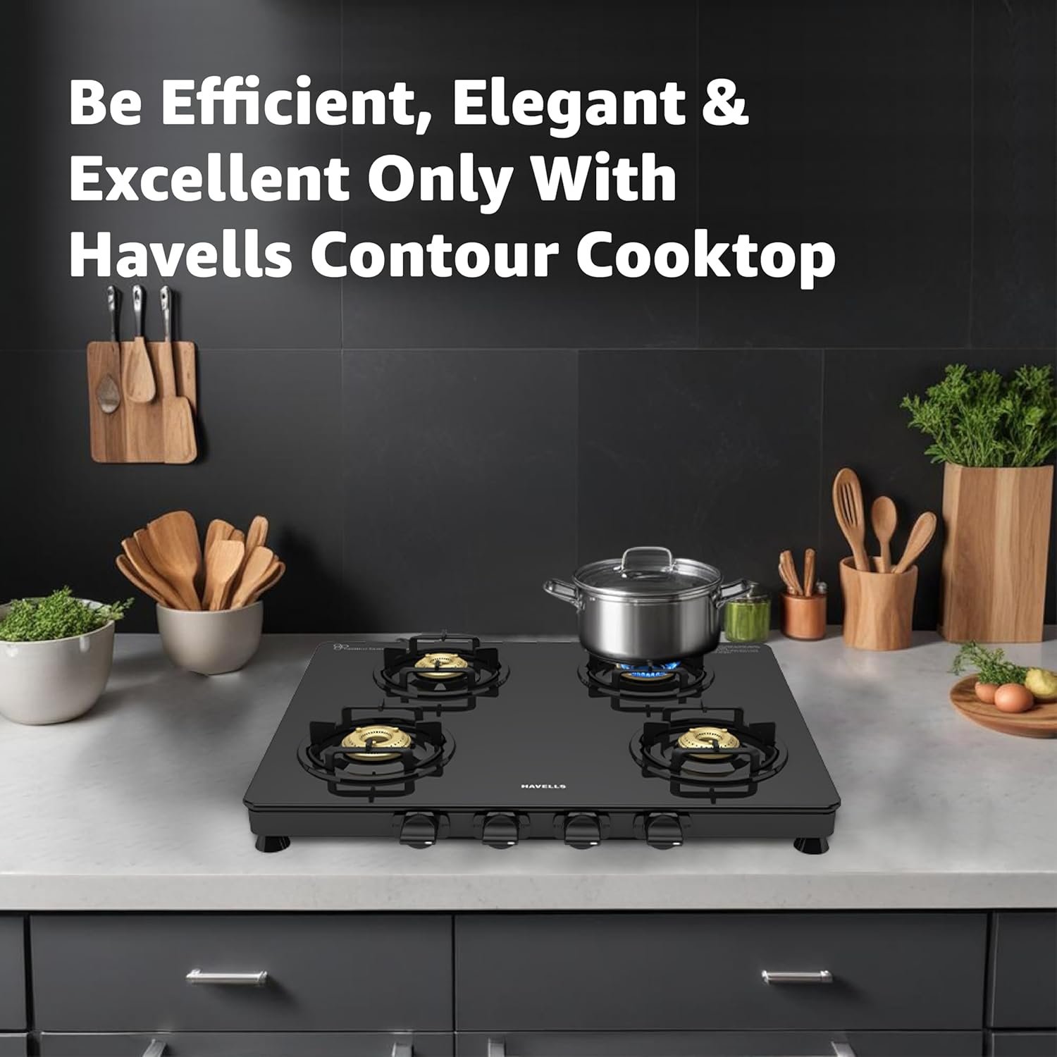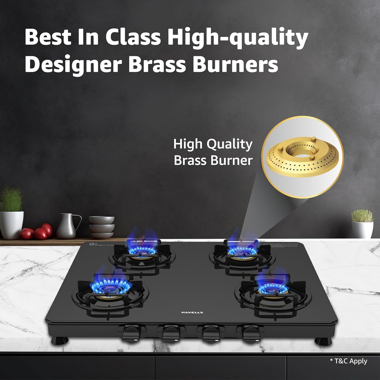 Home Gas Stoves Havells Contour Toughened Glass-Top 4 Brass Burner LPG Gas Stove | Removable Drip Tray | Soft Touch, Ergonomically Designed Knobs | 2 Years Comprehensive Warranty (Black)