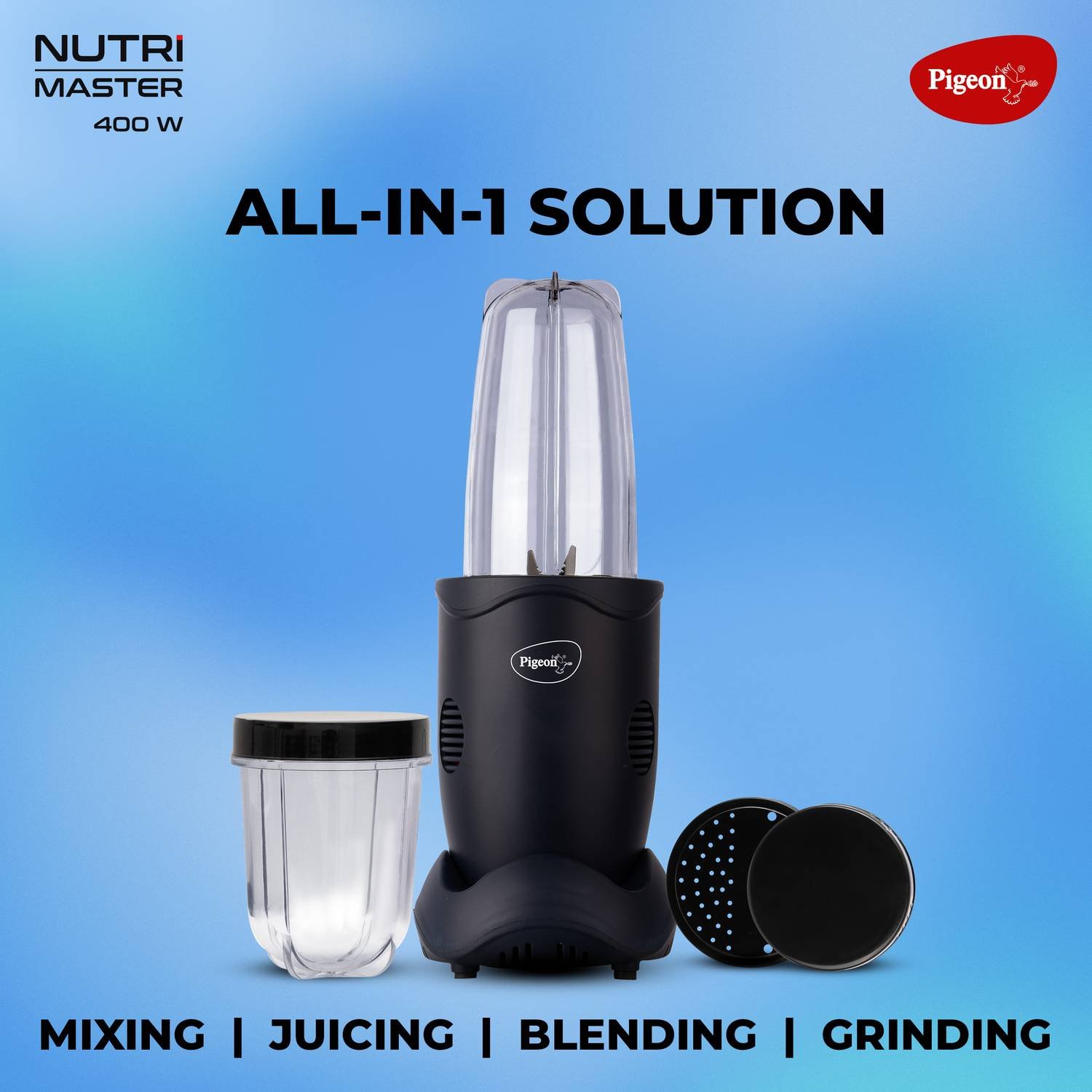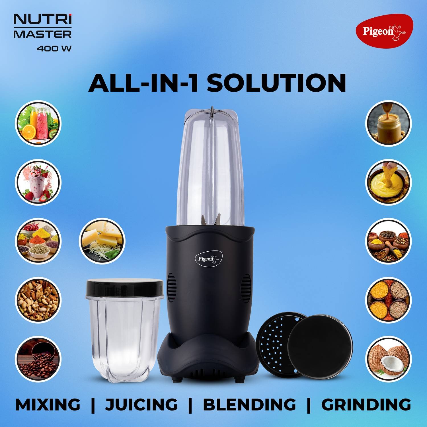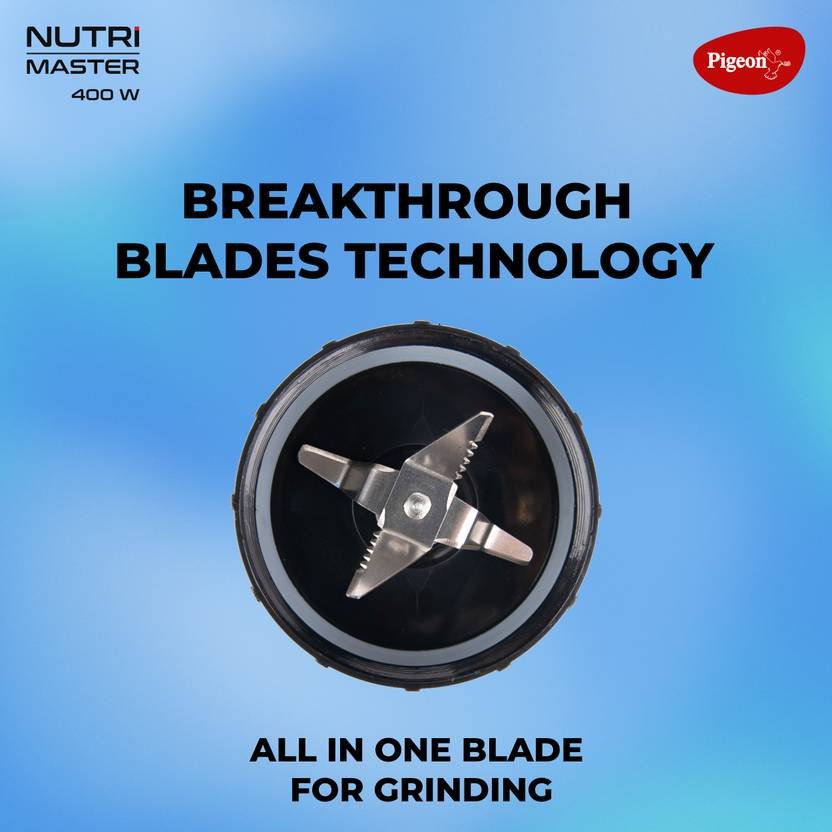 Pigeon Nutri Master, Mixing ,Juicing, Blending & Grinding System | Powerful 400W 18000 RPM motor | Stainless steel Blades | 2 unbreakable jars | 2 Storage Lids |1 Strainer Lid | 1 Socket |1 Years warranty | Blue