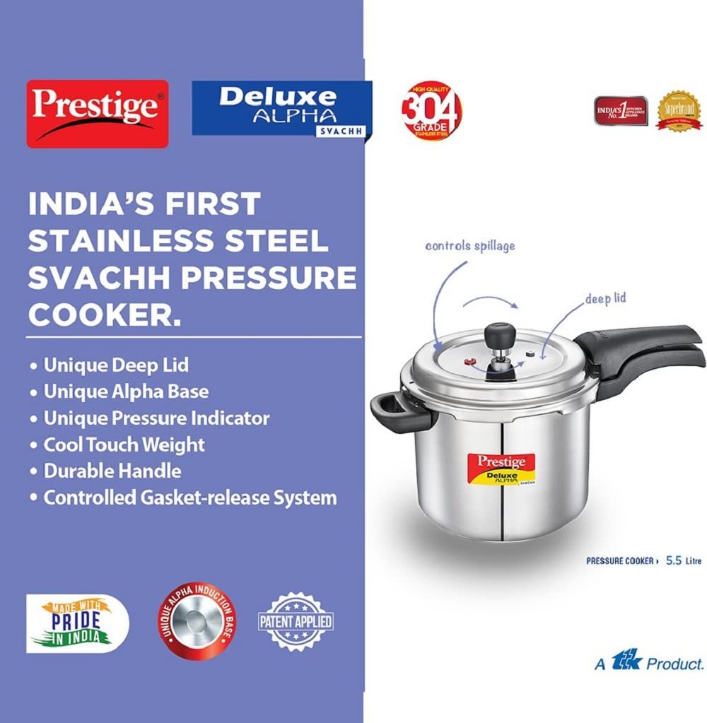 Prestige 5.5 Litre Stainless Steel Deluxe Alpha Svachh Outer lid Pressure Cooke |Deep lid for spillage control | 10 years Warranty| Gas & Induction compatible | Gasket release System| ISI Certified