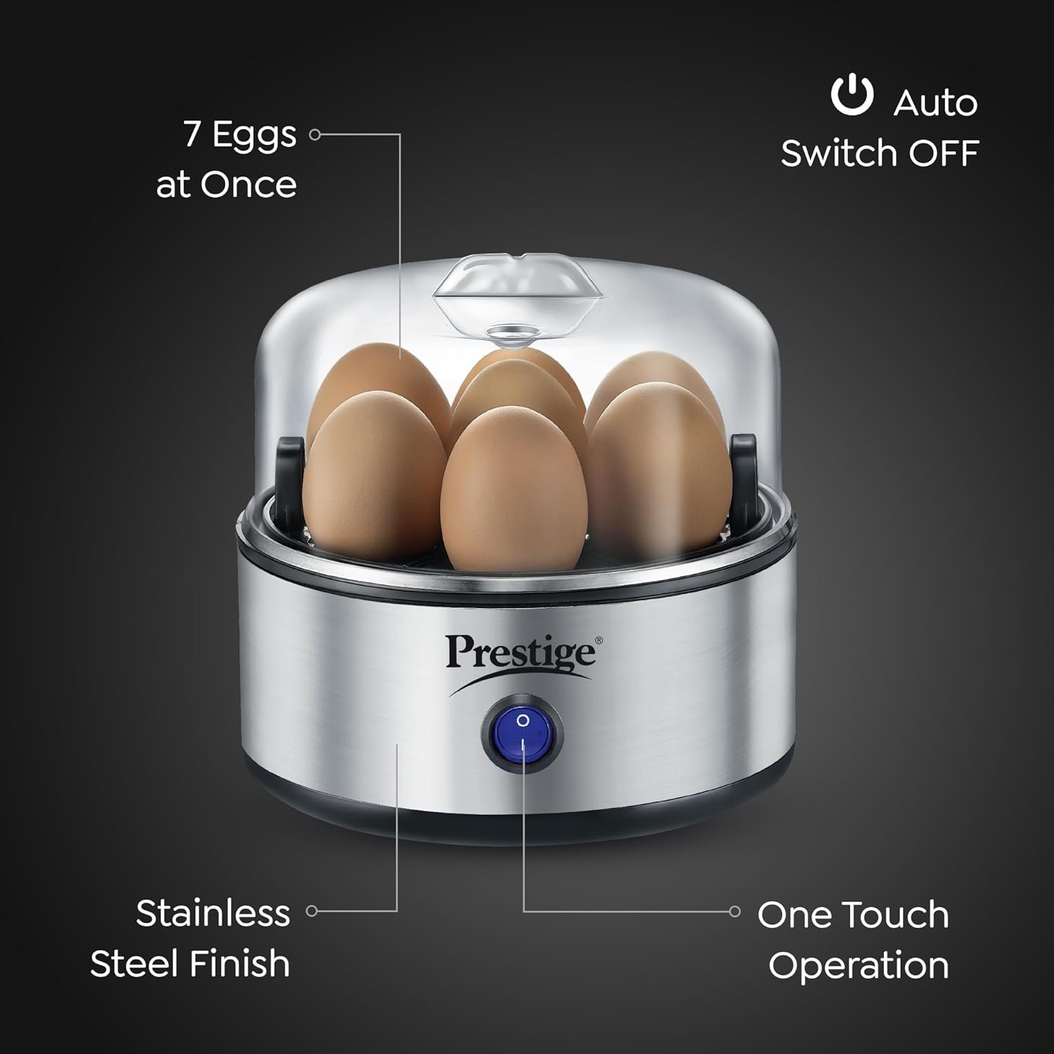 Prestige Egg Boiler PEB-01 | 350-Watt | Boils 7 Eggs at Once | One-Touch Operation | Stainless Steel Body & Heating Plate | Auto Switch-Off for Safe Cooking| Electric