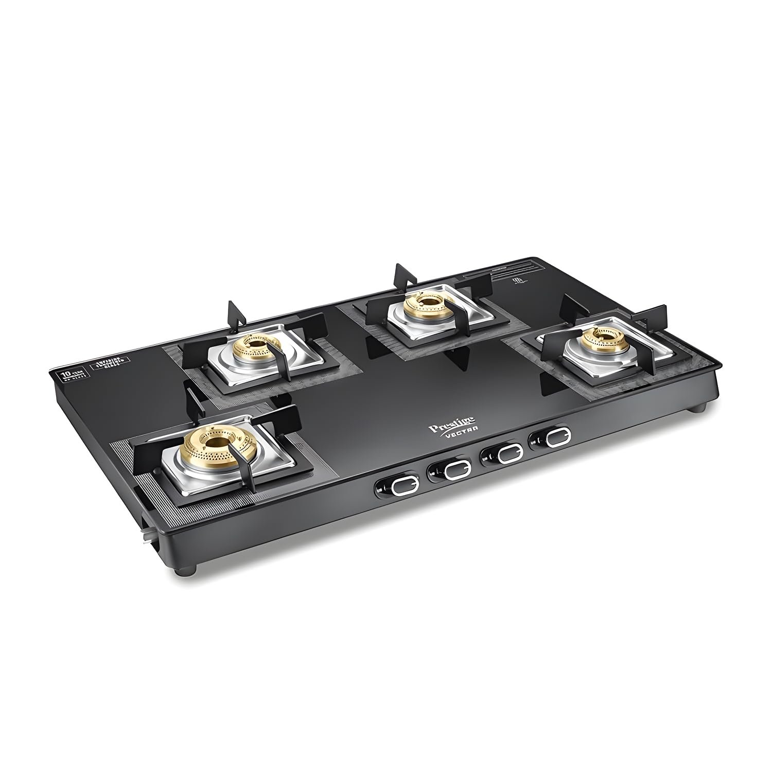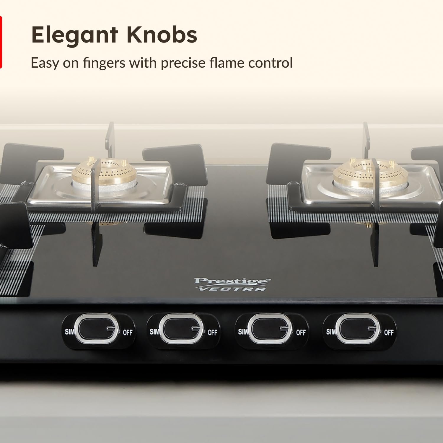 Home Gas Stoves Prestige Vectra 4 Burner Glasstop Gas Stove|Superior Toughened Glass|Jumbo Brass Burner|3-Way Gas Inlet|360 Degree Revolving Nozzle|10 Years Warranty on Glass|Black,Manual