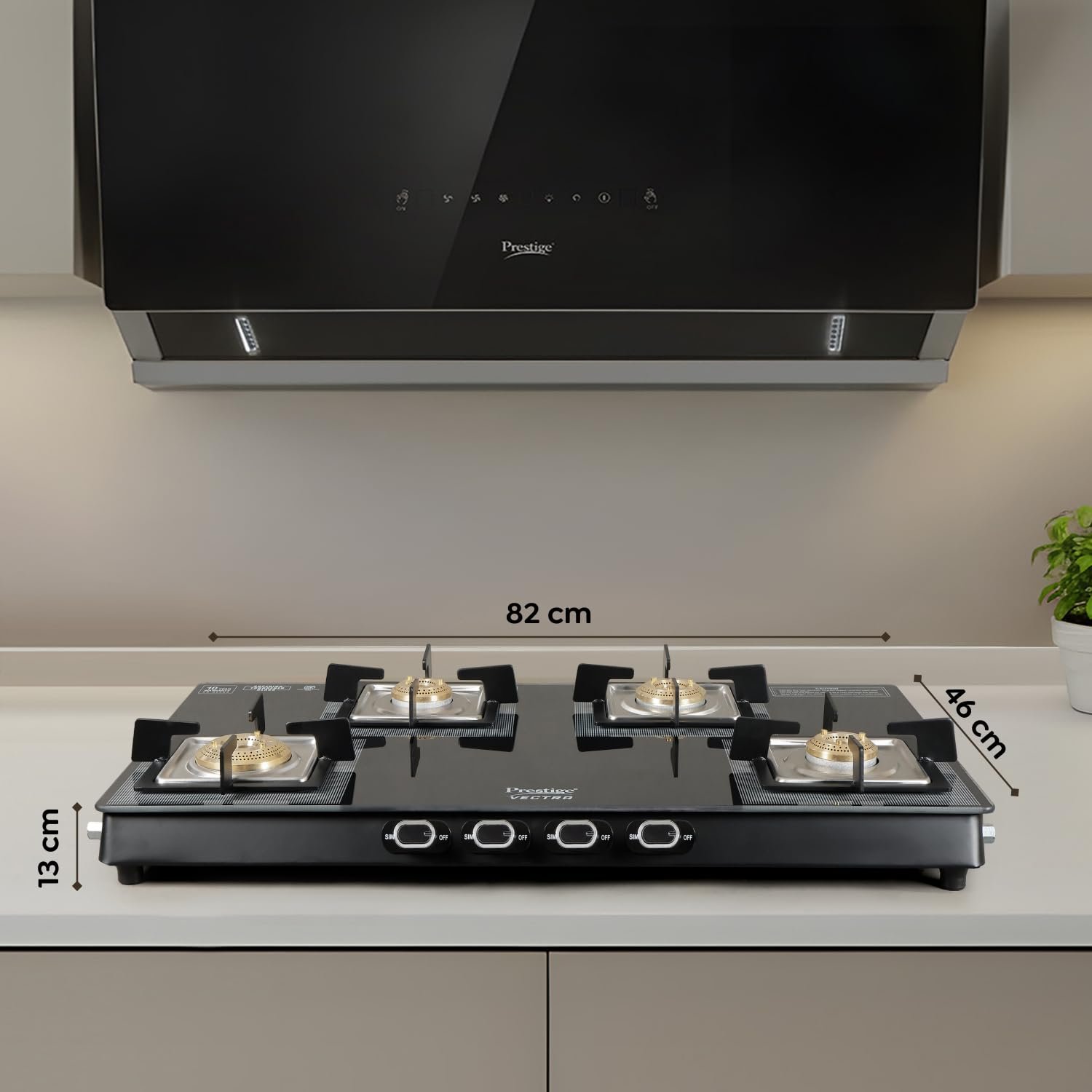 Prestige Vectra 4 Burner Glasstop Gas Stove|Superior Toughened Glass|Jumbo Brass Burner|3-Way Gas Inlet|360 Degree Revolving Nozzle|10 Years Warranty on Glass|Black,Manual