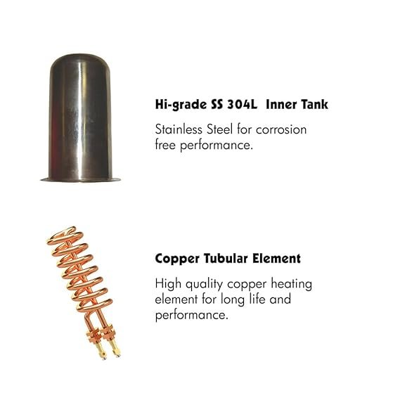 - INNER TANK: Hi Grade SS304 inner Tank for corrosion free performance; Heating Element: High Quality Copper Element for longer performance